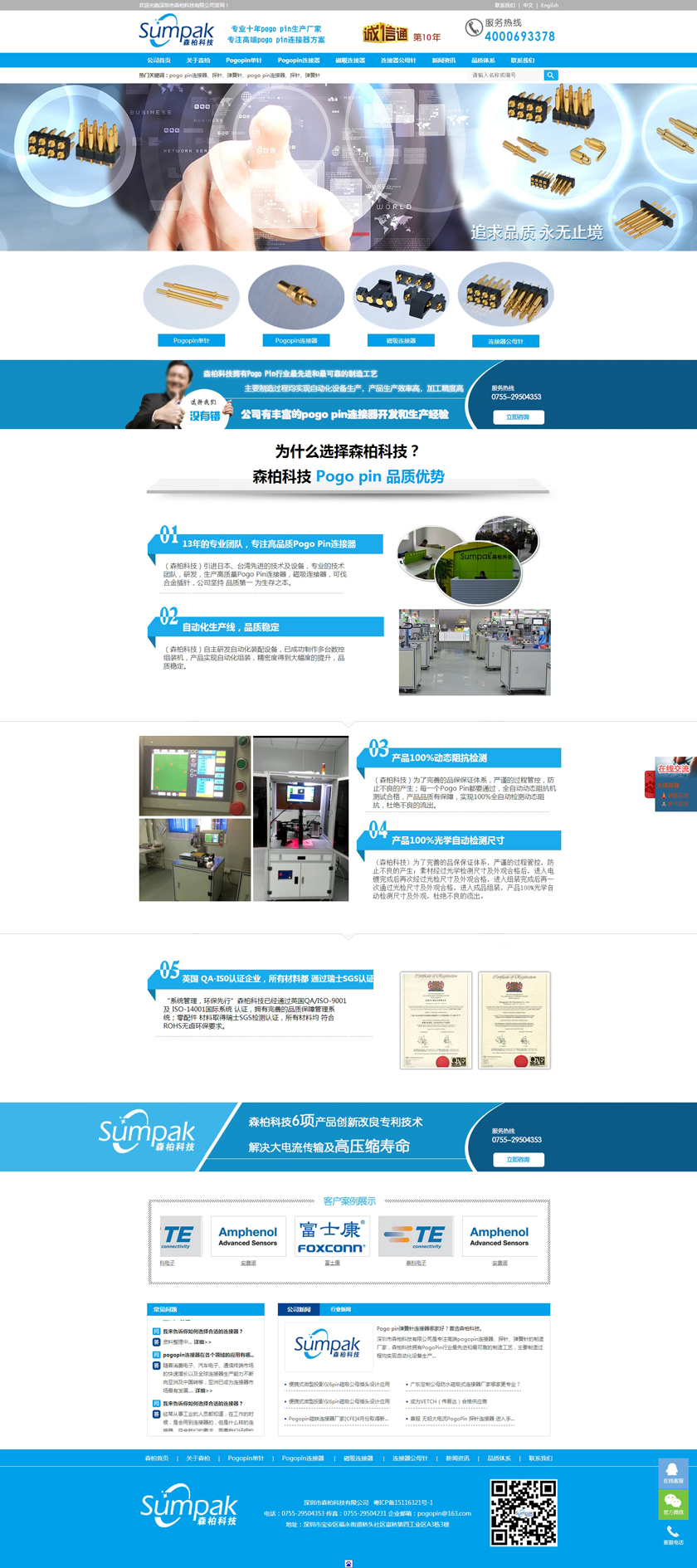 Project Description 深圳市森柏科技有限公司是专注高端pogo pin连接器、探针、弹簧针的制造厂家,森柏科技拥有Pogo Pin行业最先进和最可靠的制造工艺,主要制造过程均实现自动化设备生产,产品生产效率高,加工精度高,重要检测过程均采用自动化快速识别系统,大大降低了人为操作失误的风险,极大的提升了检测效率,工艺过程得到极大的改善和满足。因此产品质量和稳定性获得巨大突破。 Official website address 威海http://www.zgsumpak.com I want to share